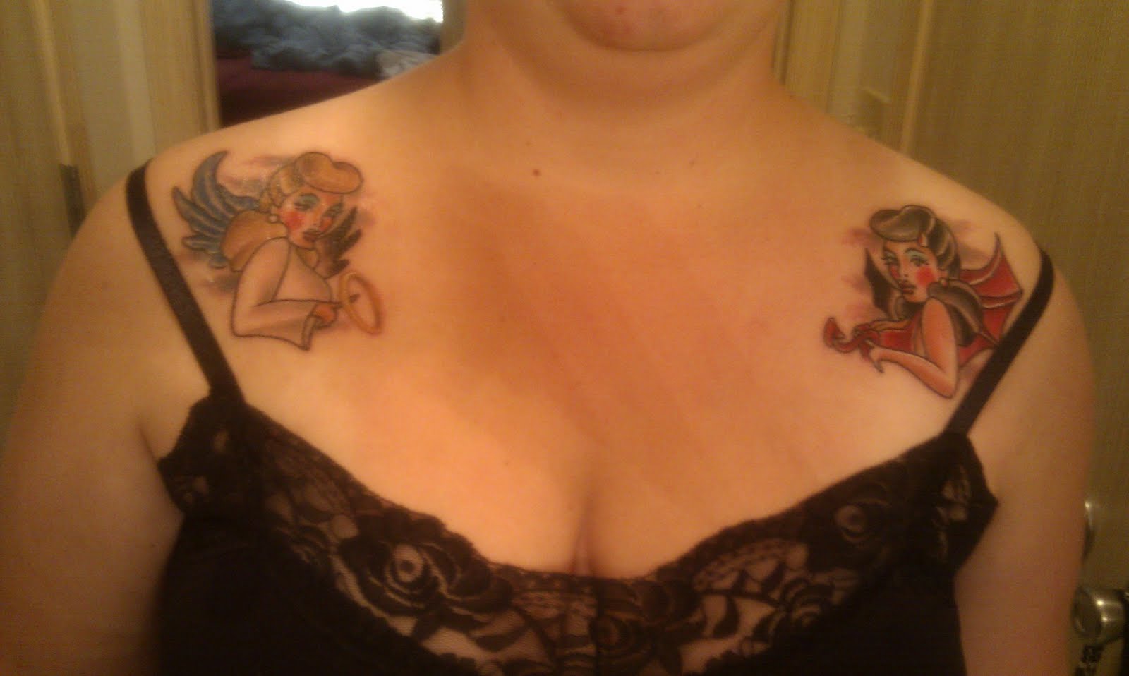 Lori got her tattoos today, and they turned out great! One devil and one angel. And Kris did a great job with them! Lori had found an angel she liked, especially the twirling the halo on her finger. But devils don't have halos to twirl, so Kris made her twirl the end of her tail around her finger so that the two had the same theme. Very cool! And he totally re-did the angel from the picture and it was way cooler! Lori says that they are her "conscience, pin-up style" ;).